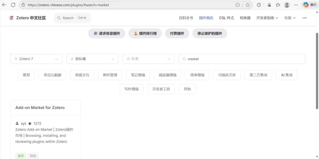 進入Zotero的中文社區,點擊插件商店。首先下載插件Add-on Market for Zotero,此插件類似於一個插件商店(其他插件要依賴這個)