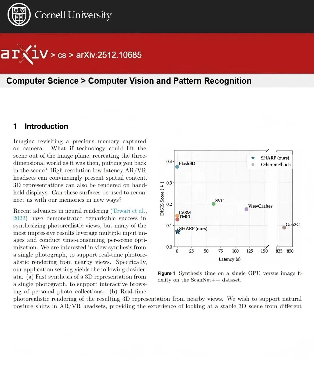 論文標題:Sharp Monocular View Synthesis in Less Than a Second