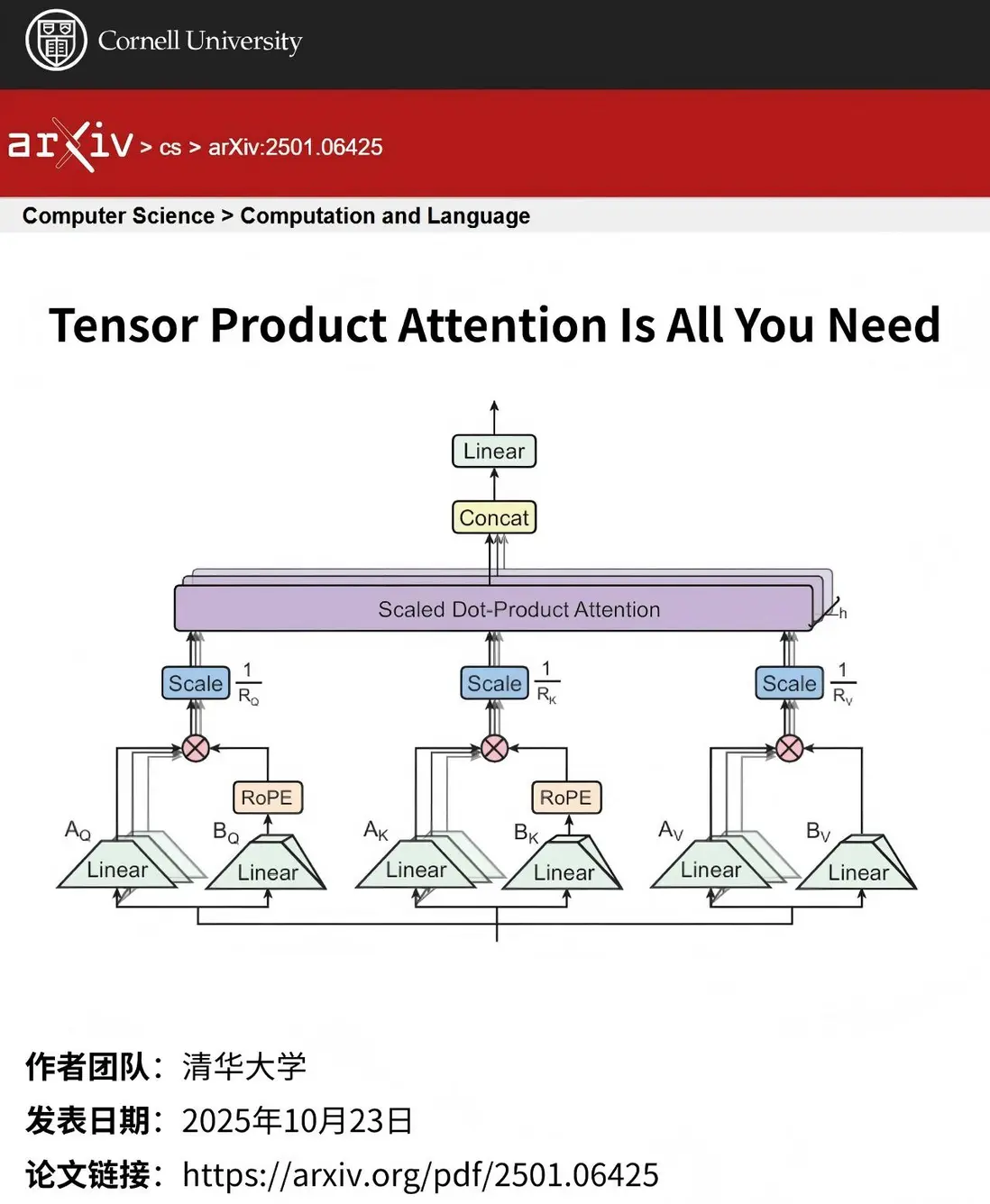 本文提出一種新型注意力機制——張量積注意力(TPA),旨在通過張量分解對查詢、鍵和值進行上下文低秩表示,顯著減少推理時的KV緩存大小,同時提升模型性能,並保持與RoPE的天然兼容性。