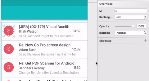 As for those avatars with letters inside, I don’t need to bother with a spreadsheet. Here’s what I did instead: I used a nested symbol to tint each avatar with a different color. And Sketch’s overrides feature does the job of dynamically replacing each letter!