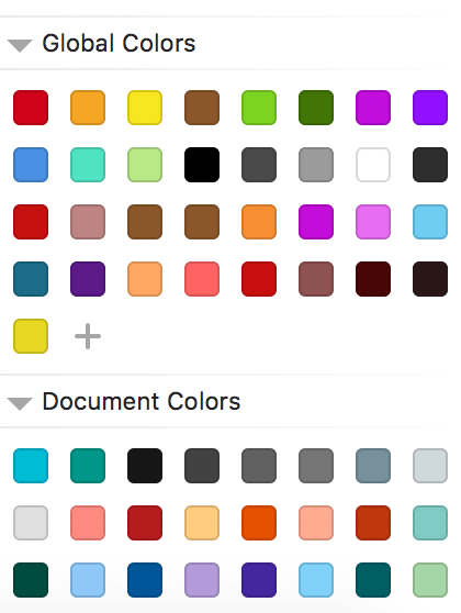 Sketch has functionality similar to Photoshop’s and Illustrator’s swatches. It’s called global and document colors, but it has some minor limitations. For example, the palette colors can’t have names; they can’t be organized in subfolders; and no commonly used palettes come preloaded in Sketch. Also, I think the margins around the color squares are a bit too wide, so a large palette might not fit comfortably in there.