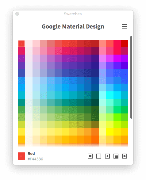 The Swatches plugin improves the situation. It comes preloaded with plenty of standard palettes, such as the Material palette, Pantone and others. I can mouse over a color to see its name, and I can apply it as a fill or stroke color or copy its HEX value with just a click.