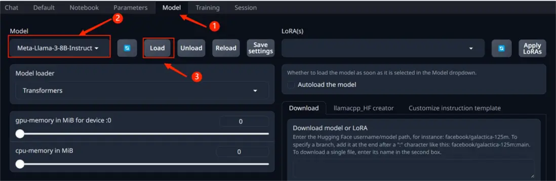 4. 載入模型① 選擇菜單欄Model② 切換模型為Meta-Llama-3-8B-Instruct