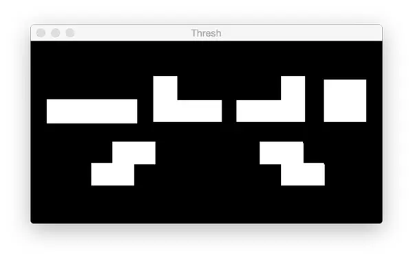 Figure 19:Prior to finding contours, 數俄羅斯方塊前we threshold the grayscale image先將圖片二值化. We performed a binary inverse threshold so that the foreground shapes become white while the background becomes black.