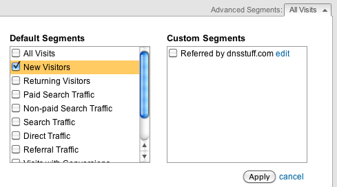 To change the user segment that you’re looking at, go to your list of error events and click the drop-down menu next to “Advanced Segments.” By selecting “New Visitors” and then hitting “Apply,” the data will update to show only the errors that “New Visitors” have encountered.