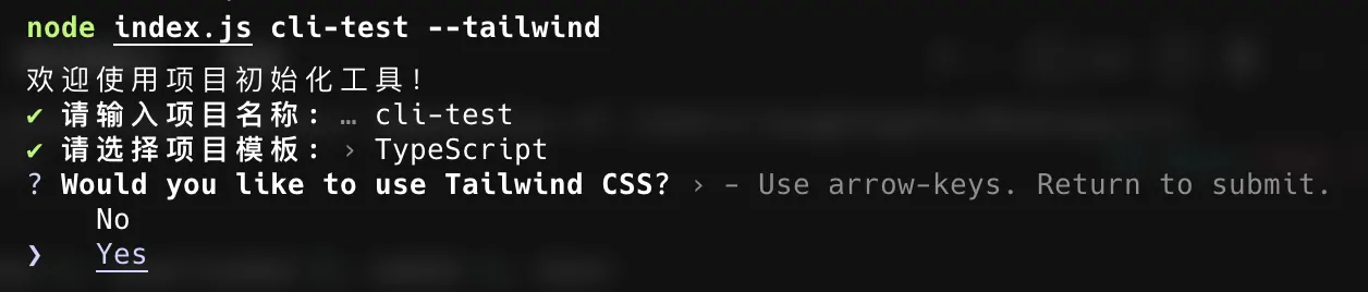 其實到這裏 CLI 的基本內容就完事了,我們可以在本地執行 node index.js cli-test --tailwind 去測試下。