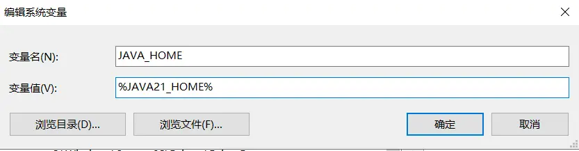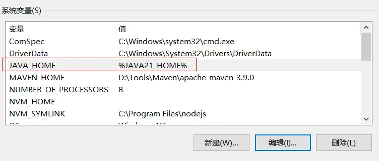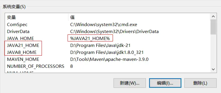 這個%JAVA21_HOME%中的JAVA21_HOME,也是系統變量中的一個變量(後面新建),JAVA_HOME對應的值其實是它的值。後面可以將它替換成其他變量,如JAVA8_HOME。