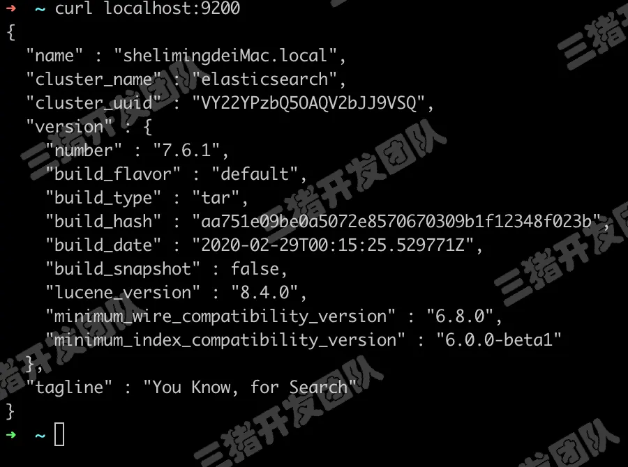 新開一個黑窗口輸入:curl localhost:9200,收到如下信息説明啓動成功。
