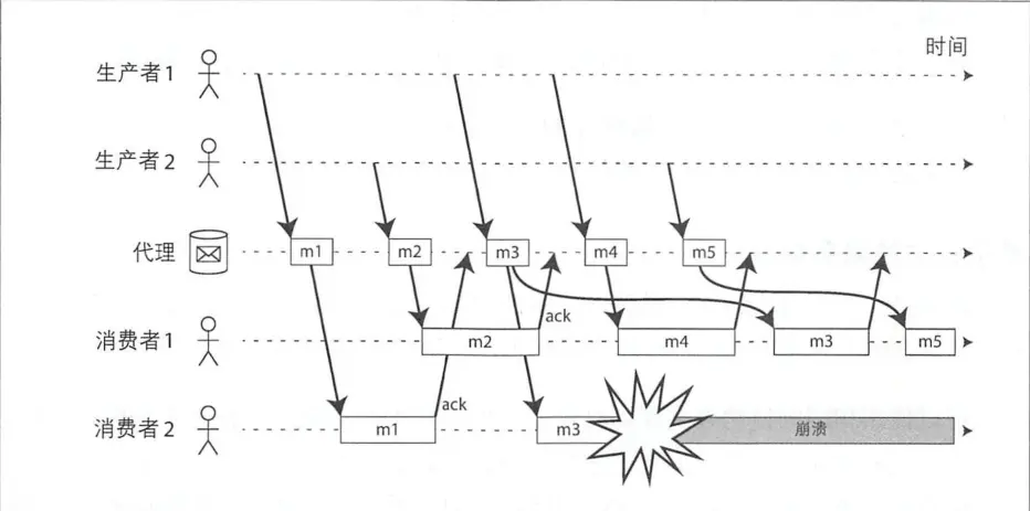 以上面的圖為例,如消費者2在消費m3的時候突然發生崩潰,此時消費者1,剛好消費m4消費完畢,然而下一個消費確實意料之外的消息m3,最後才是消費m5。出現這樣的情況由於消費者2消費m3的時候沒有對消息代理進行迴應。