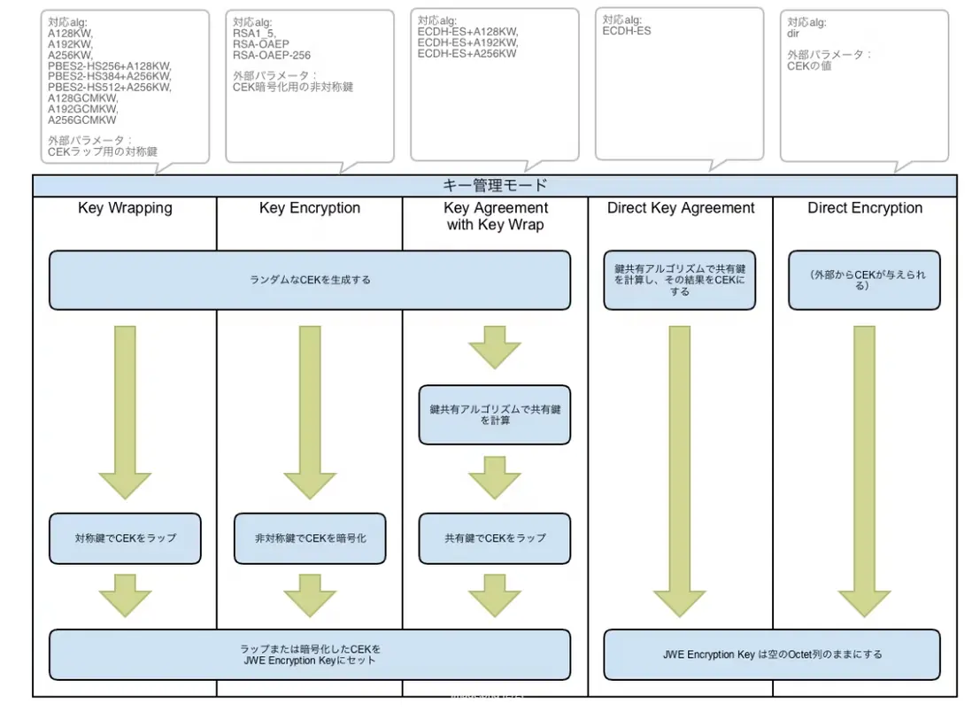 alg ヘッダパラメータによって指定されるアルゴリズムは、それぞれ対応する 鍵管理モード を持ちますが、この鍵管理モードにより定義される方法で、コンテンツを暗號化する コンテンツ暗號化キー(CEK) が生成または用意されます。鍵管理モードとして、以下の5種類のモードが定義されています。