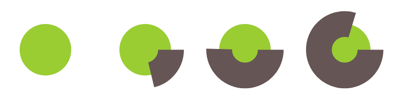Our pie chart will be green (specifically yellowgreen) with brown (#655) showing the percentage. We might be tempted to use skew transforms for the percentage part, but as a little experimentation shows, they prove to be a very messy solution. Instead, we will color the left and right parts of our circle in our two colors, and use a rotating pseudo-element to uncover only the percentage we need.