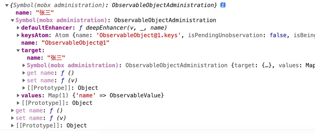 綜上extendObservableObjectWithProperties作用即循環原始對象,執行以上4步,實現了將原始對象的屬性代理到target上,並將值轉換到可觀察值,存儲在target[$mobx].values中。