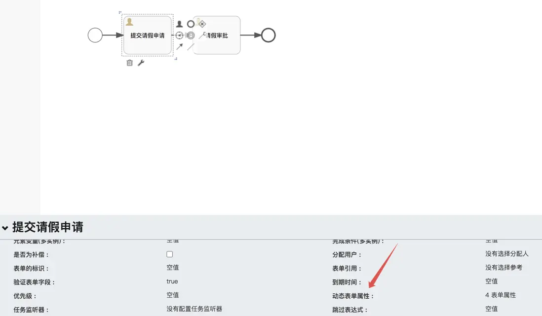 在第一個任務節點中,需要填寫請假的基本信息,那麼我們選中該節點,然後點擊動態表單屬性,如下圖: