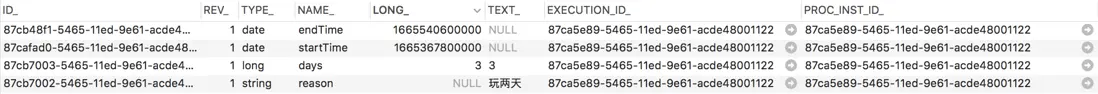流程實例啓動成功之後,我們在 ACT_RU_VARIABLE 表中就可以看到這些動態表單的信息。