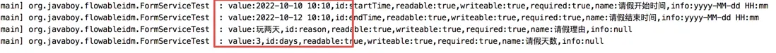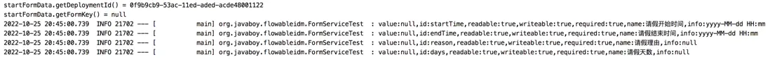 小夥伴們可以看到,這個查詢是通過流程定義查詢的,所以這裏查詢到的信息,其實也是和流程實例無關的。只是單純的查看一下啓動節點上有哪些動態表單需要輸入,以及這些動態表單的類型。最終輸出日誌如下: