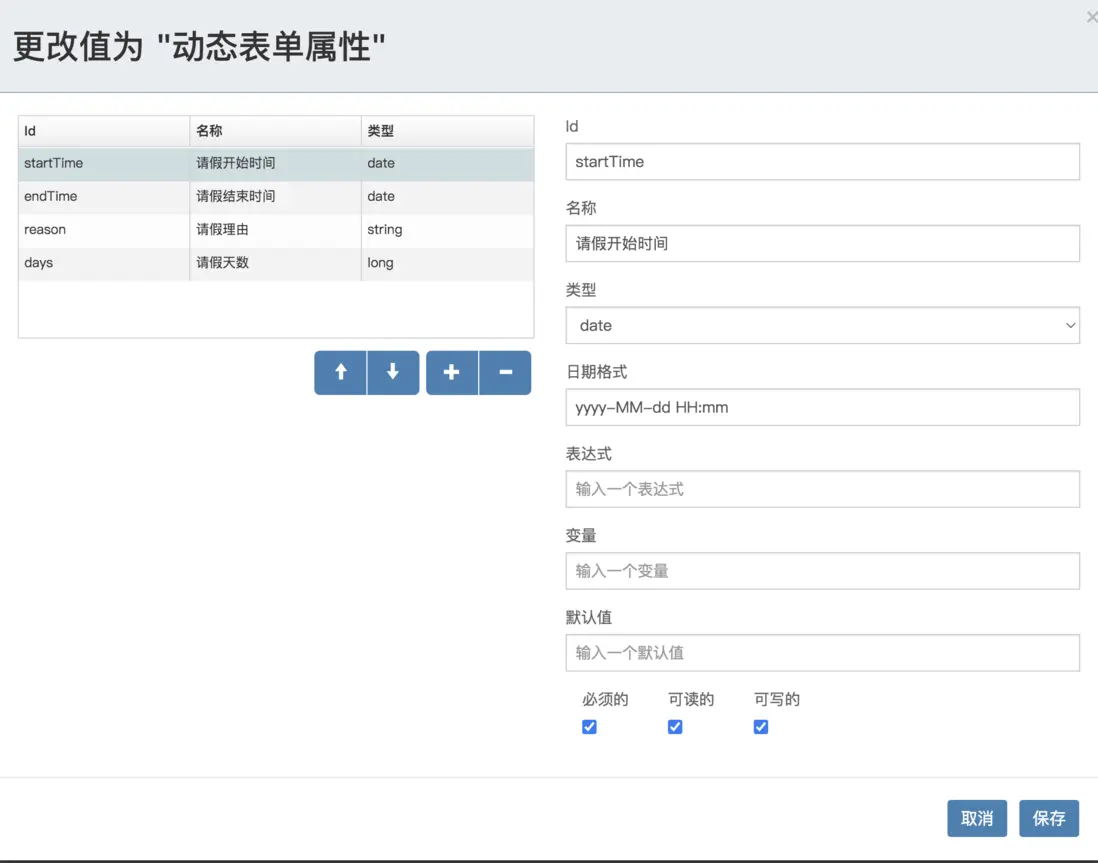 <flowable:formProperty id="startTime" name="請假開始時間" type="date" datePattern="yyyy-MM-dd HH:mm" required="true"></flowable:formProperty>