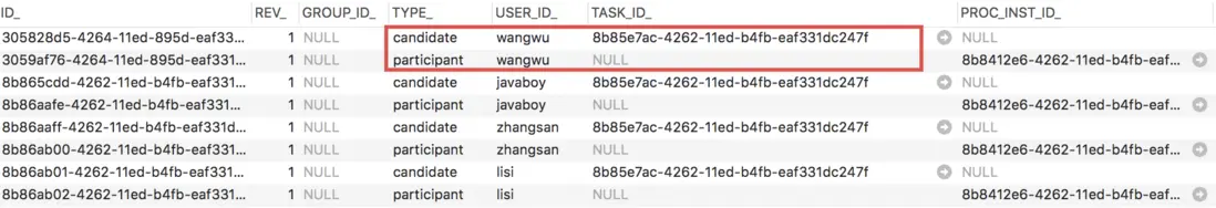 添加完成後,查看 ACT_RU_IDENTITYLINK 表,我們發現 wangwu 已經添加進來了:
