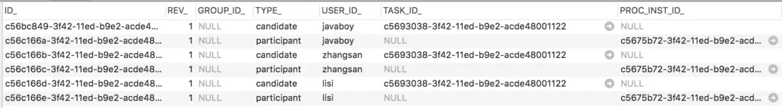 另外一種常見的需求就是,已經知道了要處理的流程實例了,但是不知道應該由誰來處理,此時通過查詢 ACT_RU_IDENTITYLINK 表就可以確定一個流程實例都有哪些參與者,如下: