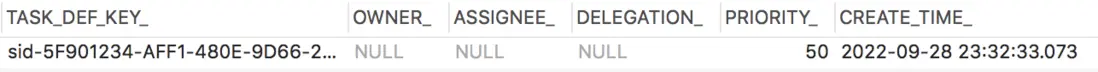 那我們就去檢查 ACT_RU_TASK 表以及它的 ASSIGNEE_ 字段,結果如下:
