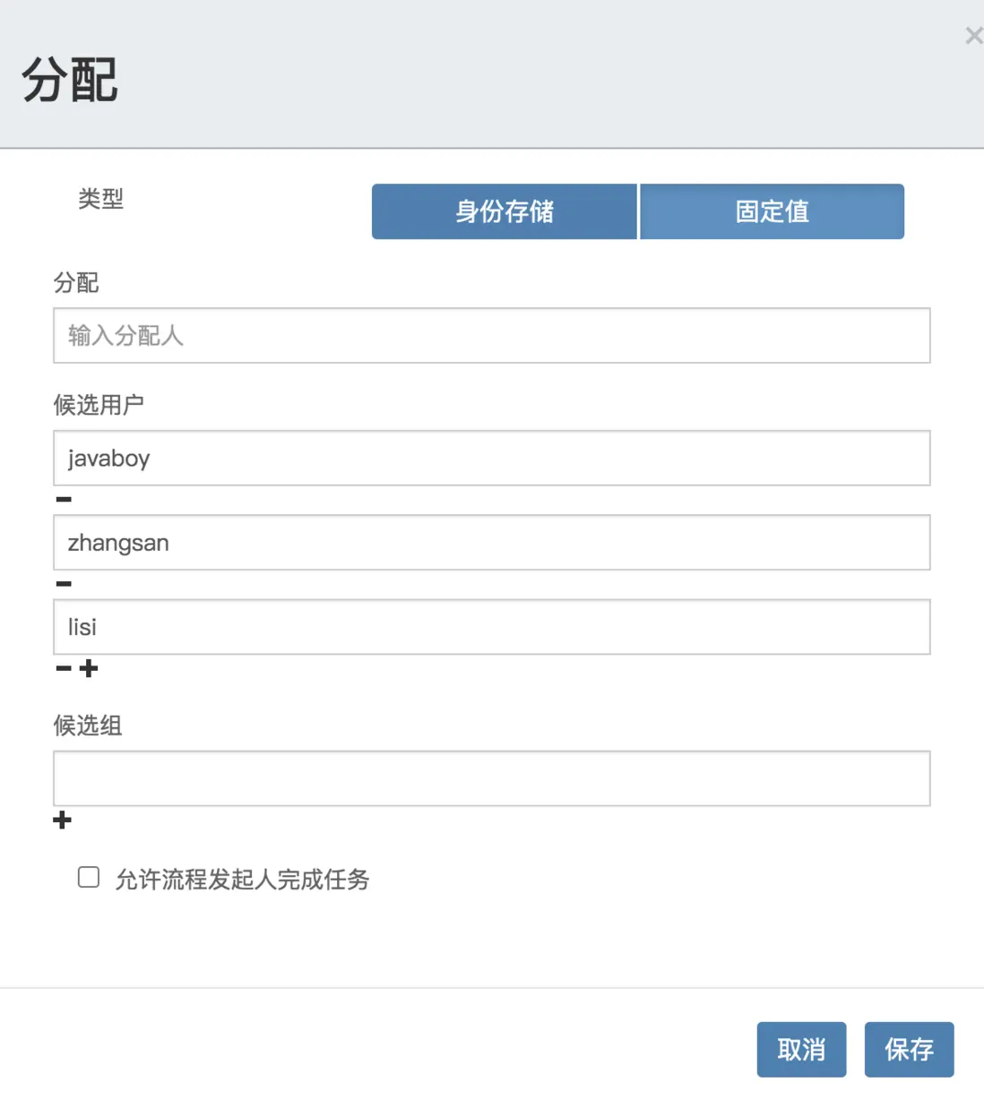 <userTask id="sid-5F901234-AFF1-480E-9D66-2D196B910BA3" flowable:candidateUsers="javaboy,zhangsan,lisi" flowable:formFieldValidation="true"></userTask>