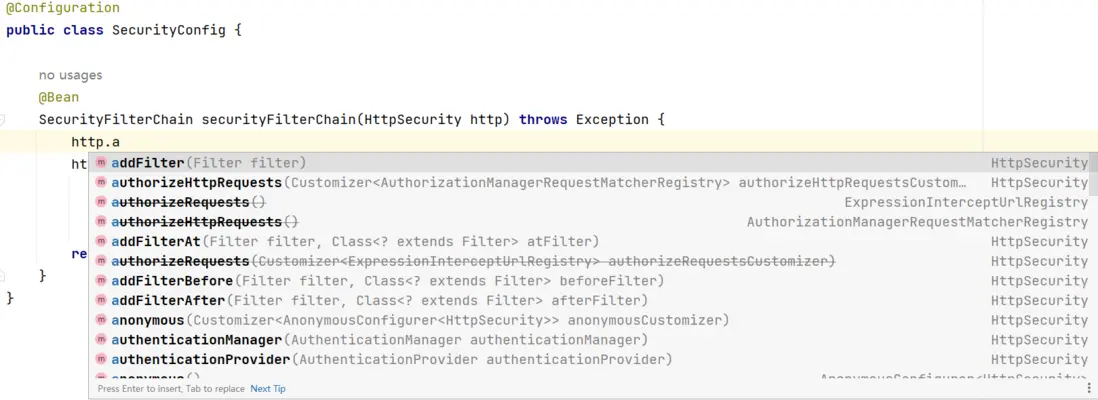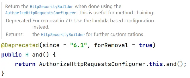 包括大家熟悉的用來連接各個配置項的 and() 方法現在也廢棄了,並且按照官方的説法,將在 Spring Security7 中徹底移除該方法。