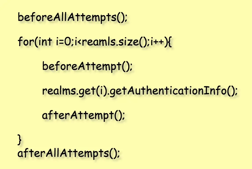 第一個和第四個方法在每次認證流程中只調用一次,而中間兩個方法則在每個 Realm 調用前後都會被調用到,偽代碼就類似下面這樣: