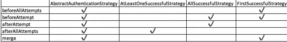 上面這四個方法,在 AuthenticationStrategy 的四個實現類中有不同的實現,我整理了下面一張表格,方便大家理解: