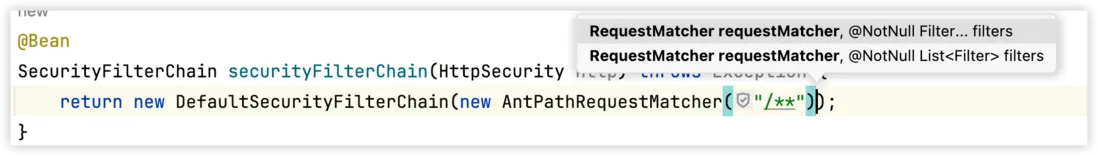 我們也可以為 DefaultSecurityFilterChain 對象去配置過濾器鏈,大家看到,它的構造器可以傳入 Filter: