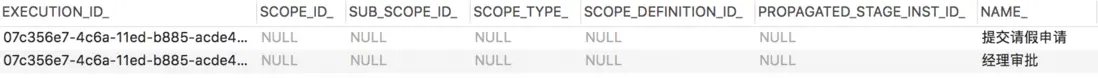 和前面的 SQL 相比,後面的 SQL 少了 WHERE RES.END_TIME_ is not NULL 條件,也就是説,判斷一個流程是否執行完畢,就看它的 END_TIME_ 是否為空,不為空就表示流程已經執行結束了,為空就表示流程尚在執行中。