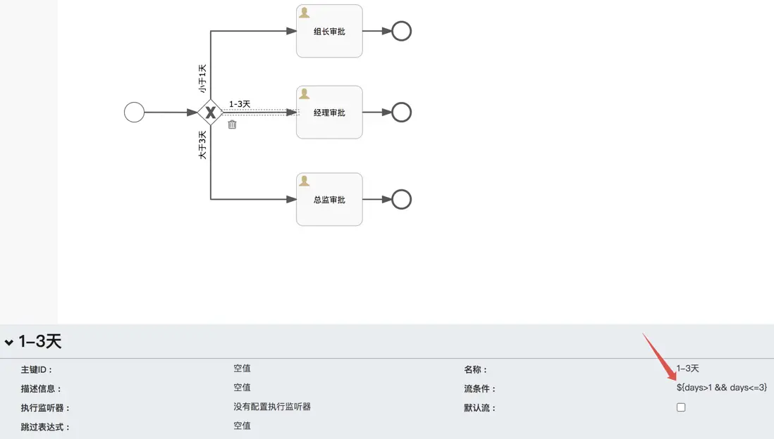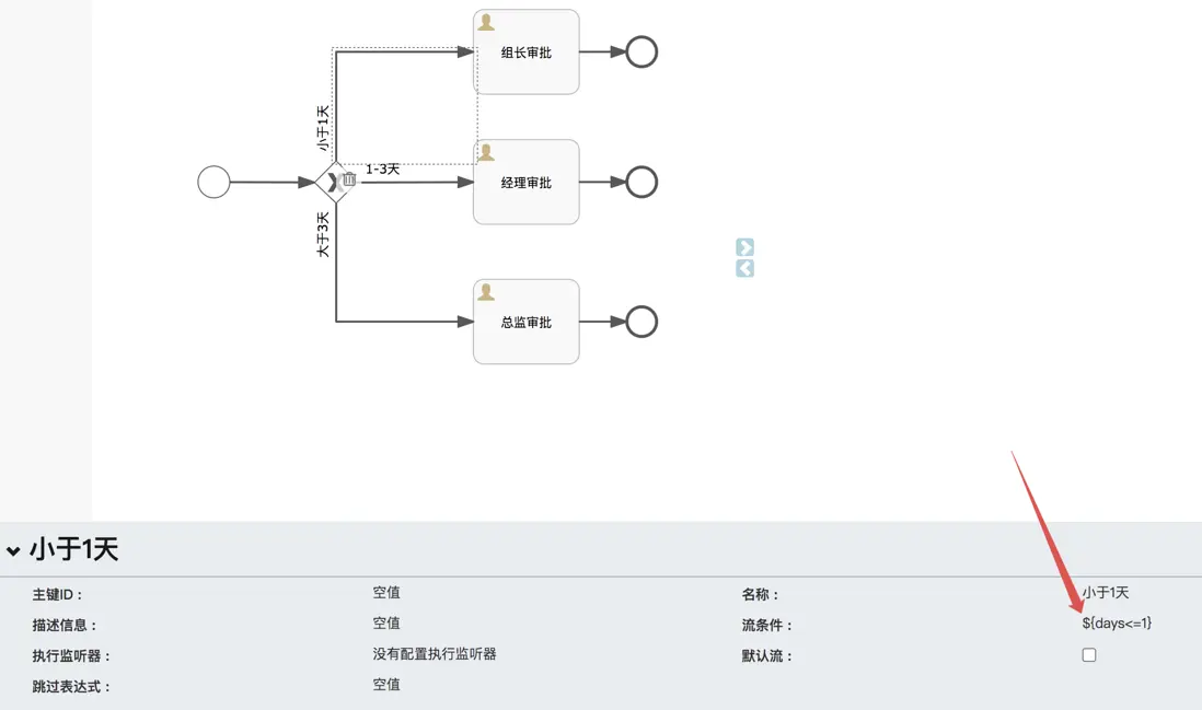 這個流條件表示當 days 這個變量的值小於等於 1 的時候,就會進入到組長審批這個 Task。