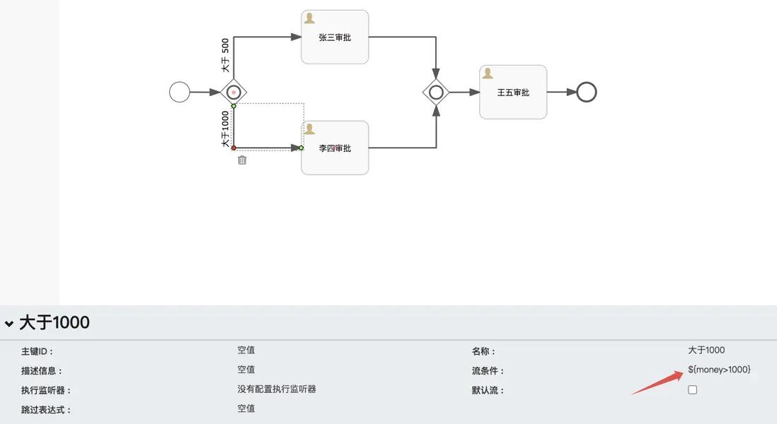 在這個流程圖中,連接線上是不需要設置條件的(不同於拍他網關),這裏即使你設置了條件,這個條件也是不會生效的。