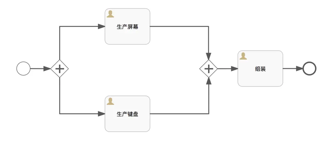 小夥伴們看到,這是一個簡化的生產筆記本的流程圖,當屏幕和鍵盤都生產好之後,再進行組裝,整個流程圖中存在兩個並行網關(成對出現)。