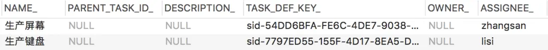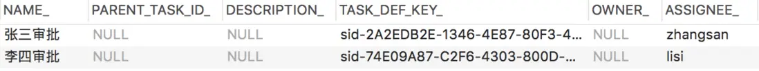 那麼此時你就會看到,在 ACT_RU_TASK 表中,出現了兩條記錄,分別是 zhangsan 審批和 lisi 審批,此時這兩個審批就是一個並行任務了: