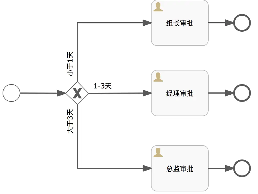 假設我有一個請假流程,請假 1 天,組長審批,請假小於 3 天,項目經理審批,請假大於 3 天,總監審批,據此,我們可以繪製如下流程圖: