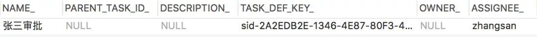流程啓動之後,我們在 ACT_RU_TASK 表中可以看到,該 zhangsan 審批了,如下: