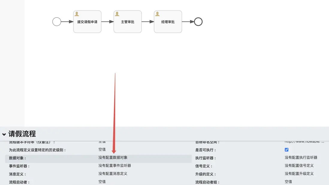 首先打開流程圖,不要選擇任何節點,在下方可以找到數據對象屬性,如下圖:
