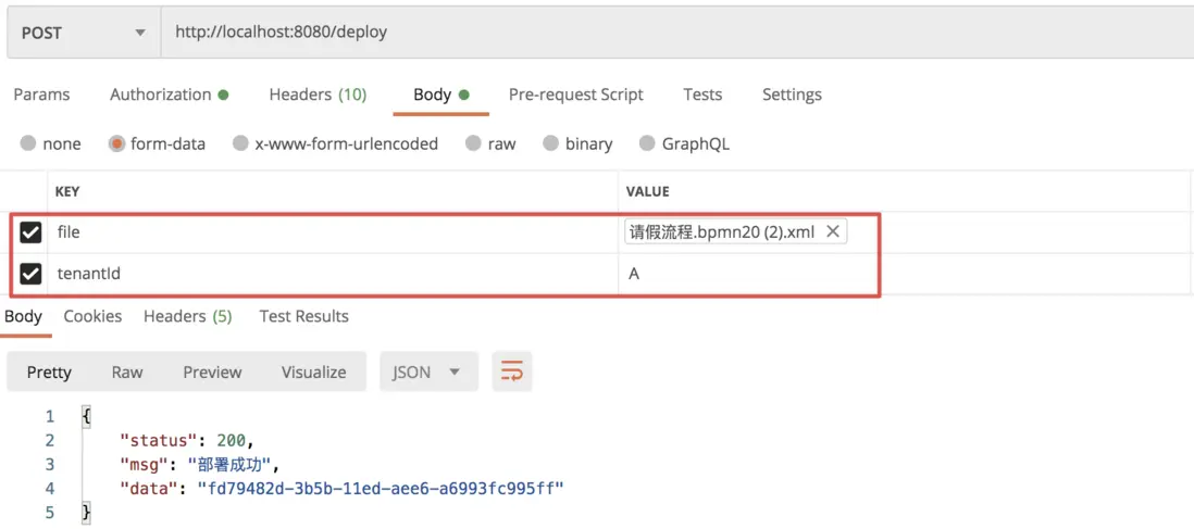 接下來我們通過 POSTMAN 來發送一個 POST 請求,提交流程圖和租户 ID 這兩個參數,如下圖:
