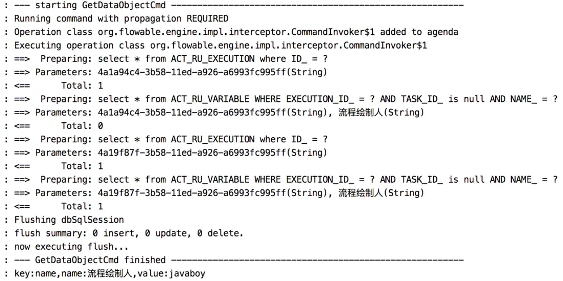 可以看到,這裏先去 ACT_RU_EXECUTION 表中查詢執行實例 ID,然後再根據拿到的執行實例 ID 去 ACT_RU_VARIABLE 表中查詢 dataObject 信息。