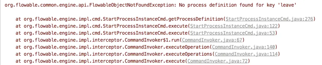 接下來我們需要啓動流程實例的時候,就不能單純拿着流程部署的 ID 去啓動了,還得拿上流程的租户 ID。如果只拿流程本身的信息去啓動,會拋出如下異常: