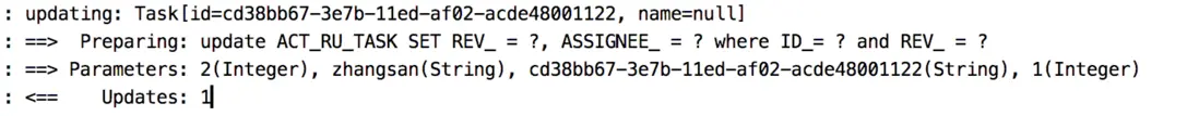這行代碼執行完成後,我們看數據庫中的 ACT_RU_TASK 表,還是剛才那條記錄,但是處理人變了,變成了 zhangsan: