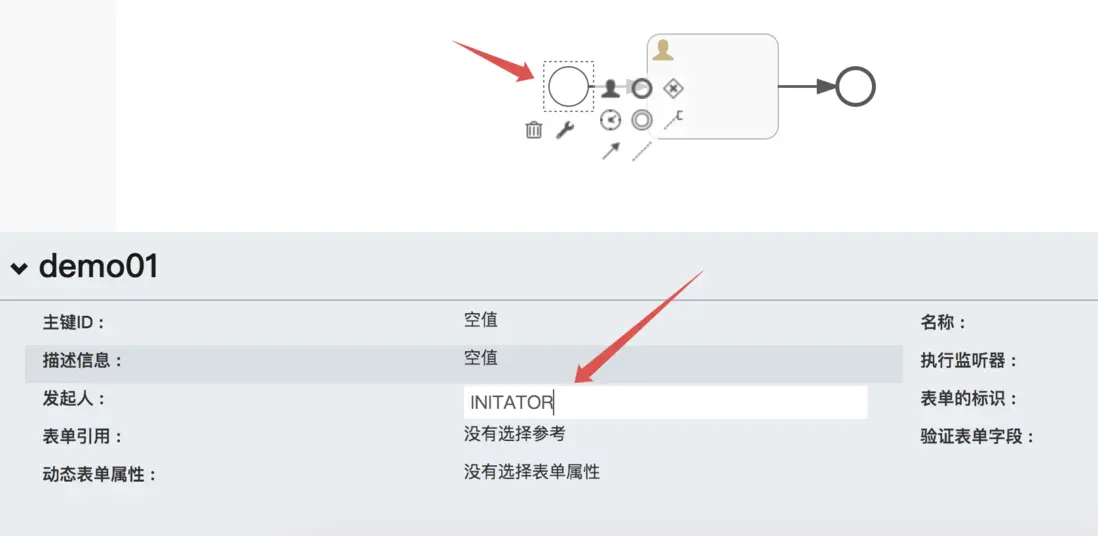 這個首先需要在流程啓動事件上設置任務的發起人變量名,如下,流程的啓動節點,然後設置任務的發起人: