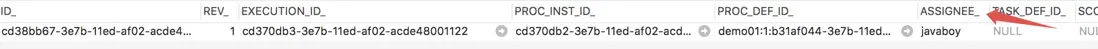 接下來,我們部署並啓動這個流程(具體的部署啓動方式可以參考本系列之前的文章),啓動之後,我們可以在數據庫的 ACT_RU_TASK 表中看到,這個 UserTask 的處理人是 javaboy,如下圖:
