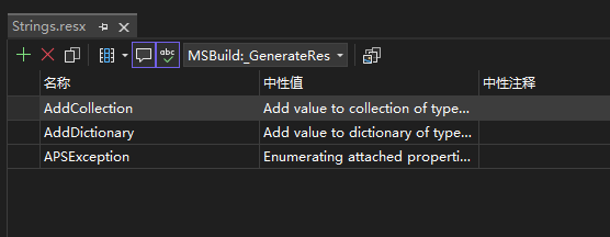 完成安裝之後,就可以嘗試多語言的加入了。只需放入 resx 文件,無論命名和放在哪個文件夾內。為了簡單起見,我隨便從 WPF 倉庫拷貝了一個 Strings.resx 文件,編輯之後的內容如下