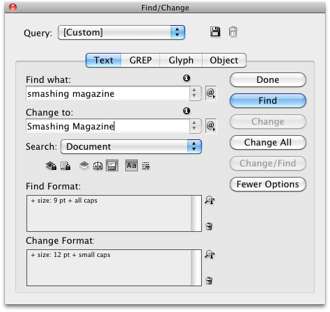Another extremely useful feature for text-heavy documents is Find/Change. I don’t know about you, but in my experience, the longer the text, the greater the chance that the client will ask me to replace all occurrences of a certain phrase or title. When you have a fully laid-out 192-page book with footnotes, glossary and index, the task of manually replacing phrases is rather daunting.