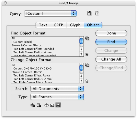 You can even search for objects by using specific formatting options. For example, if all of your frames have a black stroke, and would like to remove the stroke, you can do so by selecting the appropriate options in the Object tab of the Find/Change box.