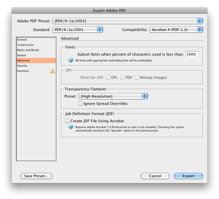 In most cases, the “High Resolution” setting will suffice. You can make sure this preset is used when exporting to PDF by going to File → Export, selecting PDF and then clicking on the “Advanced” tab. You can now set the “Transparency Flattener” option to “High Resolution” by default.