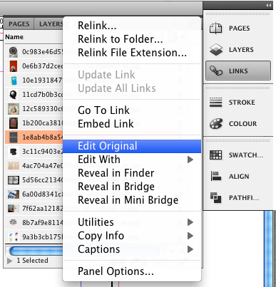 You can update placed images or check their locations directly from the Links palette. To bring up the Links menu, select the name of the image and click on the arrow to the right.