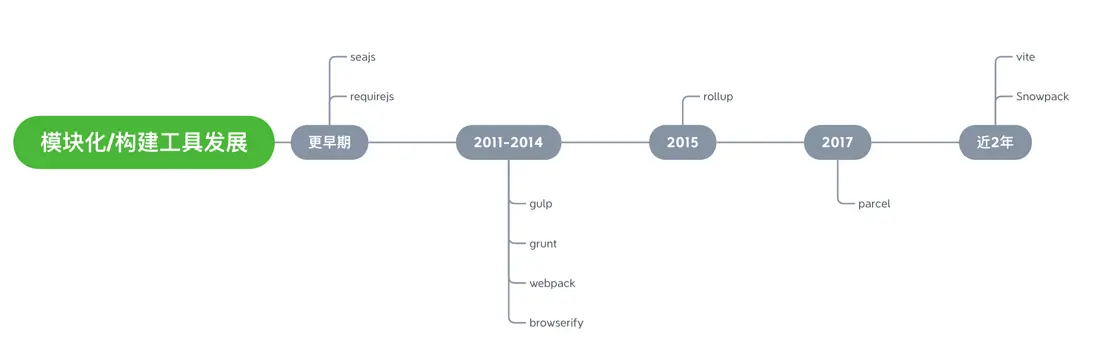 前端模塊化/構建工具從最開始的基於瀏覽器運行時加載的 RequireJs/Sea.js 到將所有資源組裝依賴打包 webpack/rollup/parcel的bundle類模塊化構建工具,再到現在的bundleless基於瀏覽器原生 ES 模塊的 snowpack/vite,前端的模塊化/構建工具發展到現在已經快 10 年了。