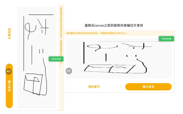 - 有個電子簽名頁面,為方便用户操作,需要做了橫屏模式的佈局展示(兼容橫豎屏,無論橫豎屏下,簽字圖都需要是橫向顯示)
