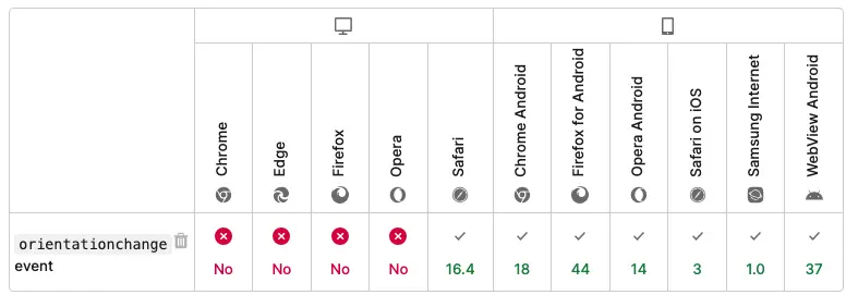 /** 90或 - 90橫屏; 0或180豎屏 */ function orientationChange(event) { this.orientationType = [0, 180].includes(event?.orientation || window.orientation) ? 'portrait' : 'landscape' }; window.addEventListener("orientationchange",orientationChange); - 兼容性